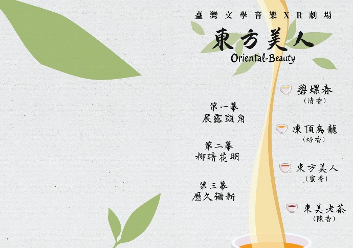 《東方美人XR》的核心敘事以清法戰爭前後的大稻埕為時空背景,並以東方美人茶的誕生傳說為主軸,將十九世紀臺灣茶(Formosa Tea)外銷的盛衰,以及白毫烏龍因小綠葉蟬啃食而產生獨特蜜香的奇妙過程,透過XR劇場形式,以戲劇性的語彙重新呈現。觀眾將置身於19世紀後期的大稻埕,在感受茶葉蛻變的瞬間,進一步認識這款凝結台灣氣候、土地與文化的經典名茶。此作品以跨域創新的形式,展現台灣茶文化的新樣貌,讓百年前的臺灣茶業歷史在光影與音樂的交會中再現風華。